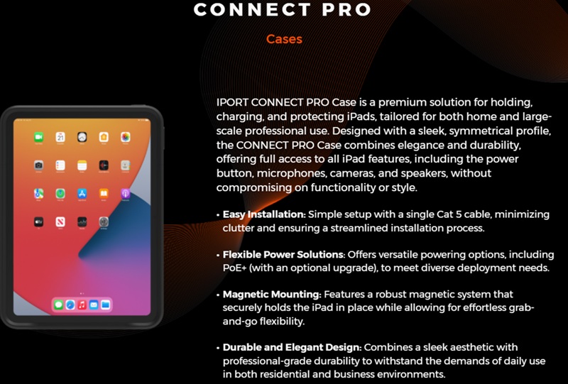 CONNECT PRO is the next generation of IPORT products for enabling iPad mobility in residential and commercial applications. Built upon a highly capable and modular platform, the CONNECT PRO line of products provide an unparalleled breadth and depth of capabilities for holding, charging, protecting and connecting iPad and iOS Devices. The CONNECT PRO Case provides both a Station interface and a Dock interface connector, allowing iPad to mount and connect to any product in the lineup. Case protects iPad from drops and falls up to 2 meters. Enable the Case lock to prevent un-authorized USB-sync or removal of iPad from the case. Combine the internal lock with any Station containing a Case lock to deliver a fully secure temporary locking system. Add a hand strap at any point for extra utility or use the strap loops to connect a shoulder strap or any other harness. Use commercial cleaners with confidence to wipe down the entire case, including exposed electronics for a fully sanitary solution. The Case is ready out of the box for charging, USB communications and network data connections in concert with capable mounting stations (stations sold separately). Utilize all iPad features while in the Case including power button, microphones and speakers. The symmetrical front bezel with hidden speaker wave guides enables a refined aesthetic when mounted on a wall. Say hello to the flexible future of mobile business with IPORT's CONNECT PRO suite of products and CONNECT PRO Case at the core.