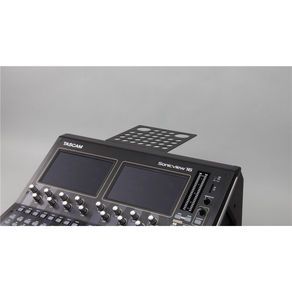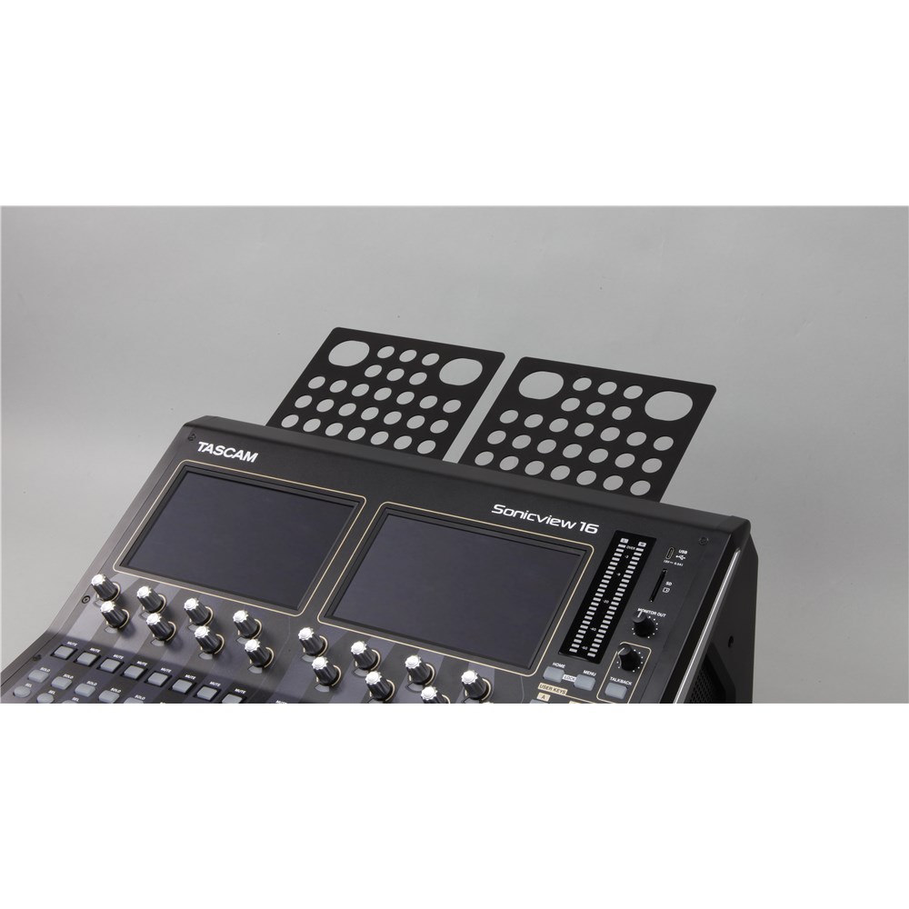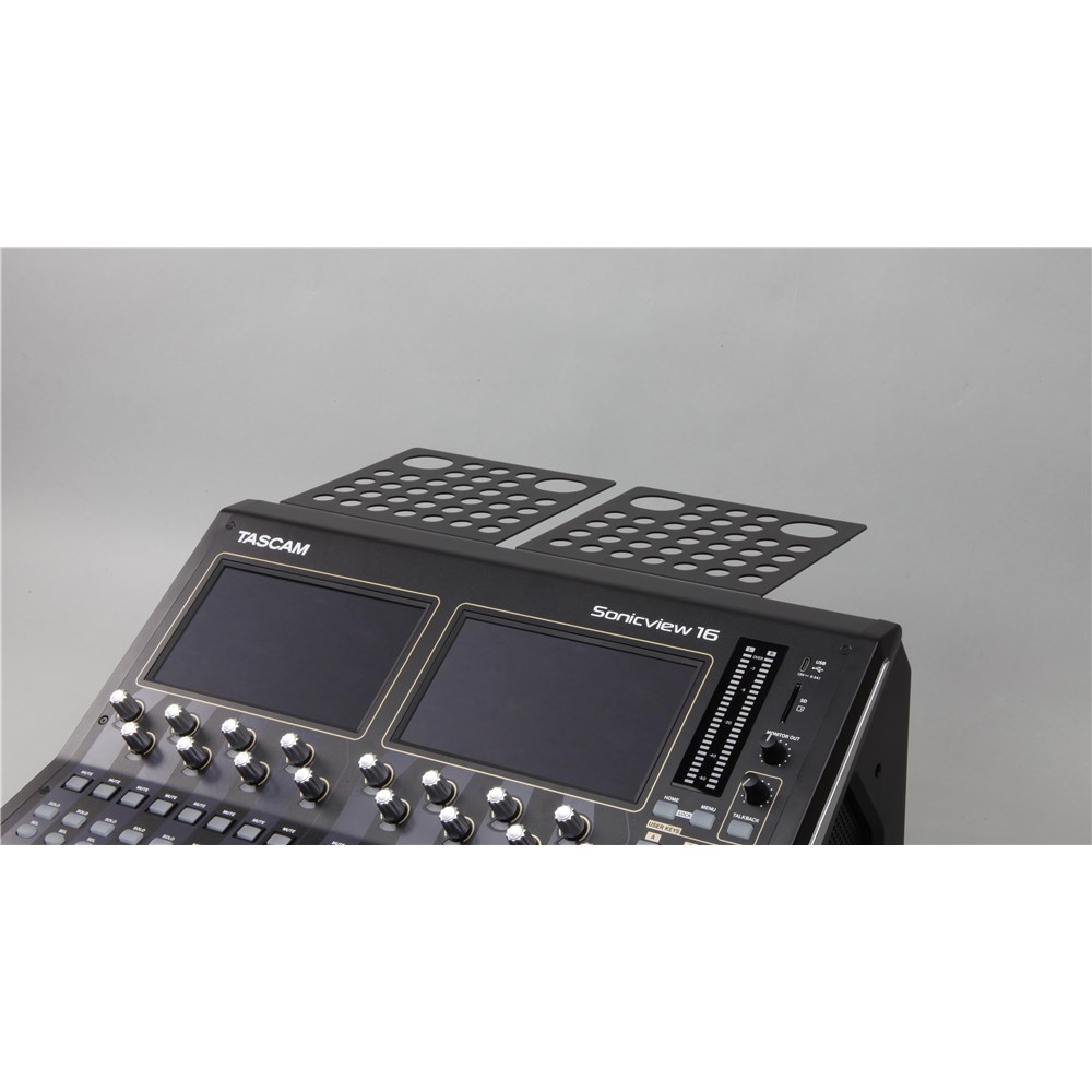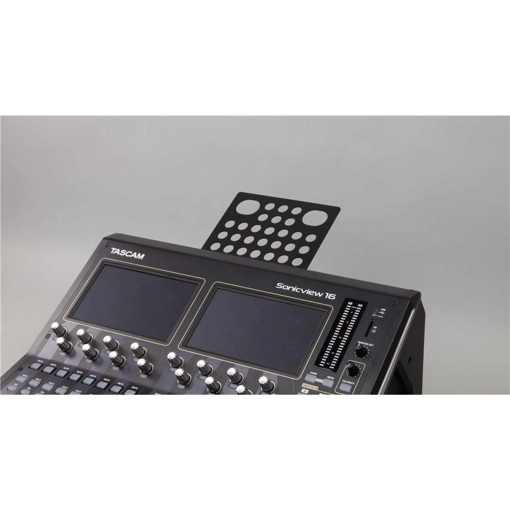 AK-TB15 securely holds a tablet device or laptop PC attached to TASCAM Sonicview 16XP and TASCAM Sonicview 24XP for remote control and settings. Available for Tablet device (angled installation) and laptop PC (horizontal installation)