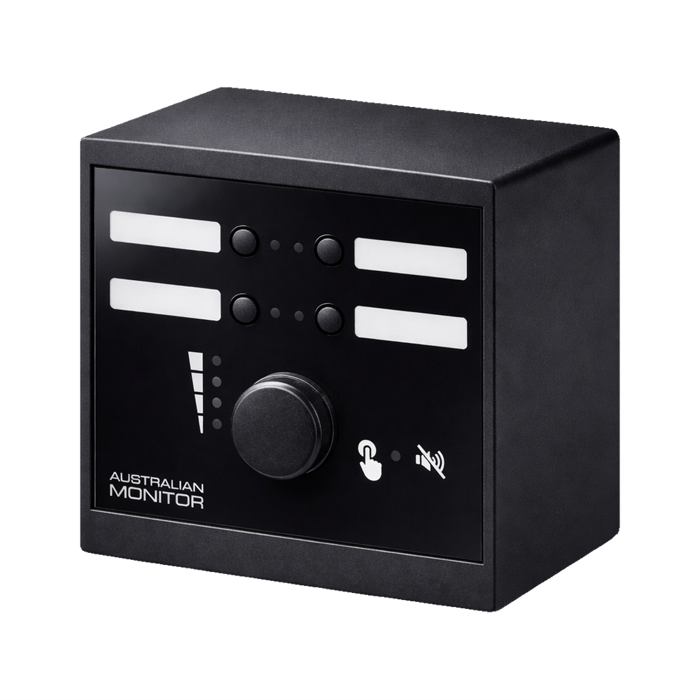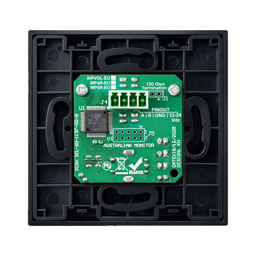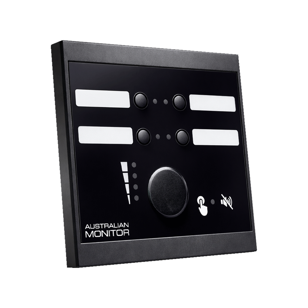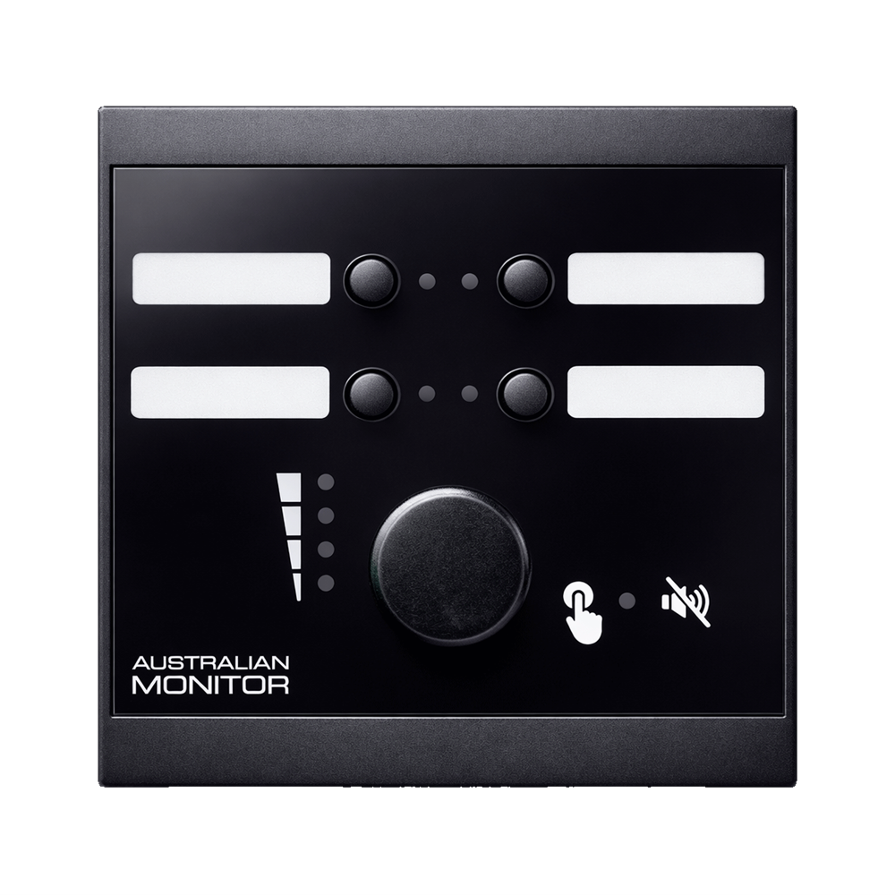 The Australian Monitor WP4R-EU programmable wall panel designed in a European/UK standard form factor. Available in black or white. It has 4 programmable buttons and a rotary encoder which can be configured with the application software of the platform it is being used with. There are also 3 GPOs on the rear of the WP4R as well as USB-C, RS485 and RS232 connections for setup.